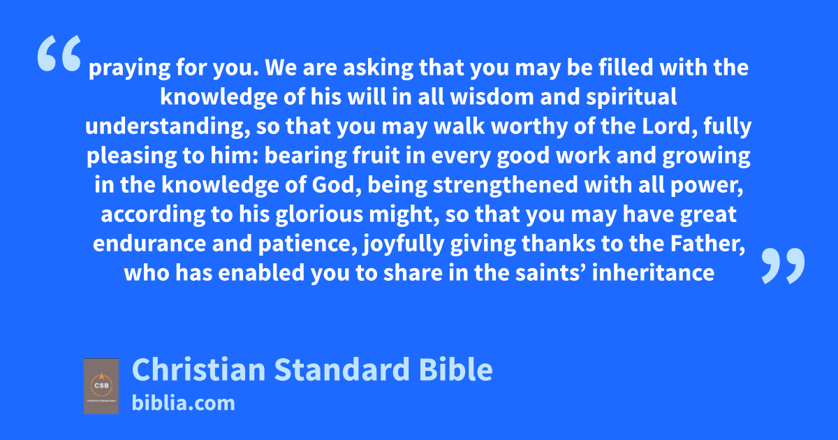 9 For this reason also, since the day we heard this, we haven’t stopped praying for you. We are askingk that you may be filled with the knowledgel of his willm in all wisdom and spiritual understanding,D 10 so that you may walk worthy of the Lord, fully pleasing to him: bearing fruit in every good workn and growing in the knowledge of God,o 11 being strengthenedp with all power,q according to his gloriousr might, so that you may have great endurance and patience, joyfully 12 giving thanks to the Father, who has enabled youE to share in the saints’ inheritance in the light.s 13 He has rescuedt us from the domain of darkness and transferred us into the kingdomu of the Sonv he loves.w 14 In him we have redemption,F the forgiveness of sins.