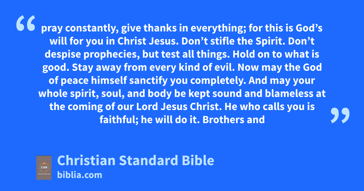 12 Now we ask you, brothers and sisters, to give recognitiont to those who labor among you and lead youA in the Lord and admonish you, 13 and to regard them very highly in love because of their work. Be at peaceu among yourselves. 14 And we exhort you, brothers and sisters:v warn those who are idle,B comfort the discouraged, help the weak, be patientw with everyone. 15 See to it that no one repays evil for evilx to anyone,y but always pursue what is good for one another and for all.z 16 Rejoiceaa always, 17 pray constantly, 18 give thanks in everything; for this is God’s willab for you in Christ Jesus. 19 Don’t stifle the Spirit. 20 Don’t despise prophecies, 21 but test all things.ac Hold on to what is good. 22 Stay awayad from every kind of evil.