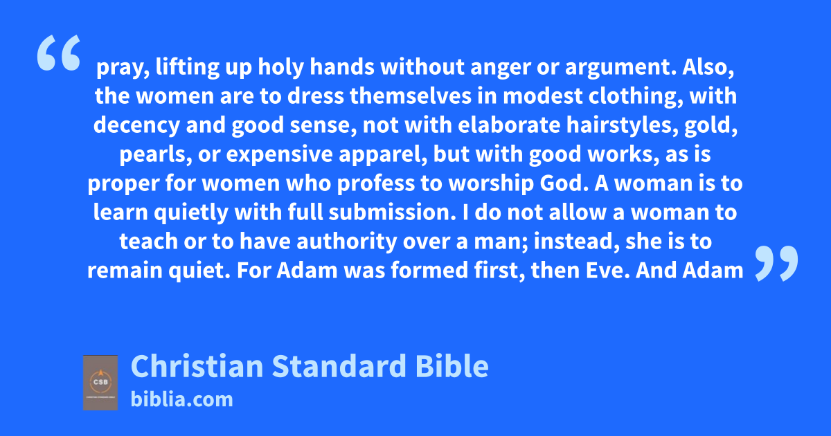 8 Therefore, I want the men in every place to pray, lifting up holy hands without anger or argument.bj 9 Also, the women are to dress themselves in modest clothing,a with decency and good sense, not with elaborate hairstyles, gold,b pearls, or expensive apparel, 10 but with good works,c as is proper for women who profess to worship God. 11 A woman is to learn quietly with full submission.d 12 I do not allow a woman to teach or to have authority over a man; instead, she is to remain quiet. 13 For Adam was formed first, then Eve.e 14 And Adam was not deceived, but the woman was deceived and transgressed.f 15 But she will be saved through childbearing, if they continue in faith, love, and holiness,g with good sense.