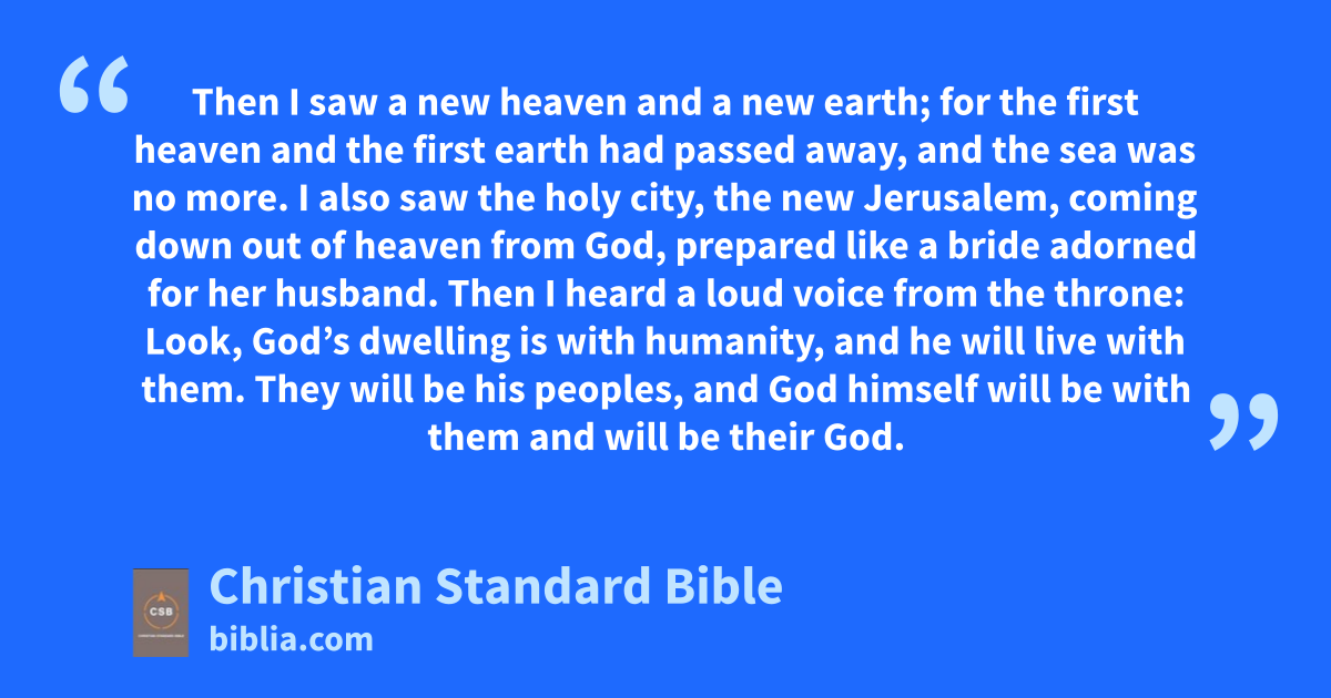 21 Then I saw a new heaven and a new earth;af for the first heaven and the first earth had passed away,ag and the sea was no more.ah 2 I also saw the holy city,ai the new Jerusalem, coming down out of heaven from God,aj prepared like a bride adorned for her husband.ak
