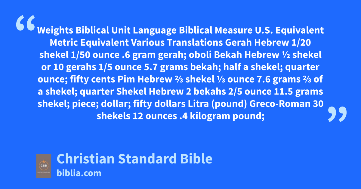 Talent | Hebrew/Greek | 3,000 shekels or 60 minas | 75 pounds/88 pounds | 34 kilograms/40 kilograms | talent/talents; 100 pounds |