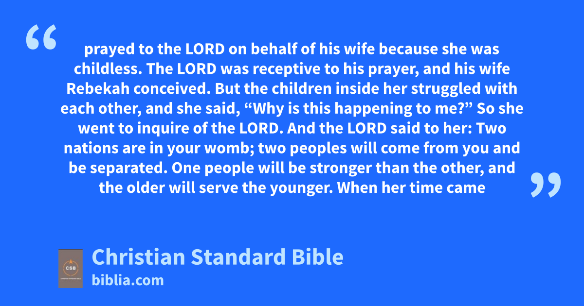 19 These are the family records of Isaac son of Abraham. Abraham fathered Isaac.m 20 Isaac was forty years old when he took as his wife Rebekahn daughter of Bethuel the Aramean from Paddan-aramo and sister of Laban the Aramean.p 21 Isaac prayed to the Lord on behalf of his wife because she was childless.q The Lord was receptive to his prayer, and his wife Rebekah conceived.r 22 But the children inside her struggled with each other, and she said, “Why is this happening to me?”H So she went to inquire of the Lord.s 23 And the Lord said to her: