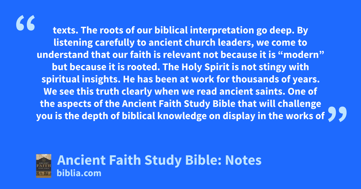 texts. The roots of our biblical interpretation go deep. By listening carefully to ancient church leaders, we come to understand that our faith is relevant not because it is “modern” but because it is rooted. The Holy Spirit is not stingy with spiritual insights. He has been at work for thousands of years. We see this truth clearly when we read ancient saints. One of the aspects of the Ancient Faith Study Bible that will challenge you is the depth of biblical knowledge on display in the works of