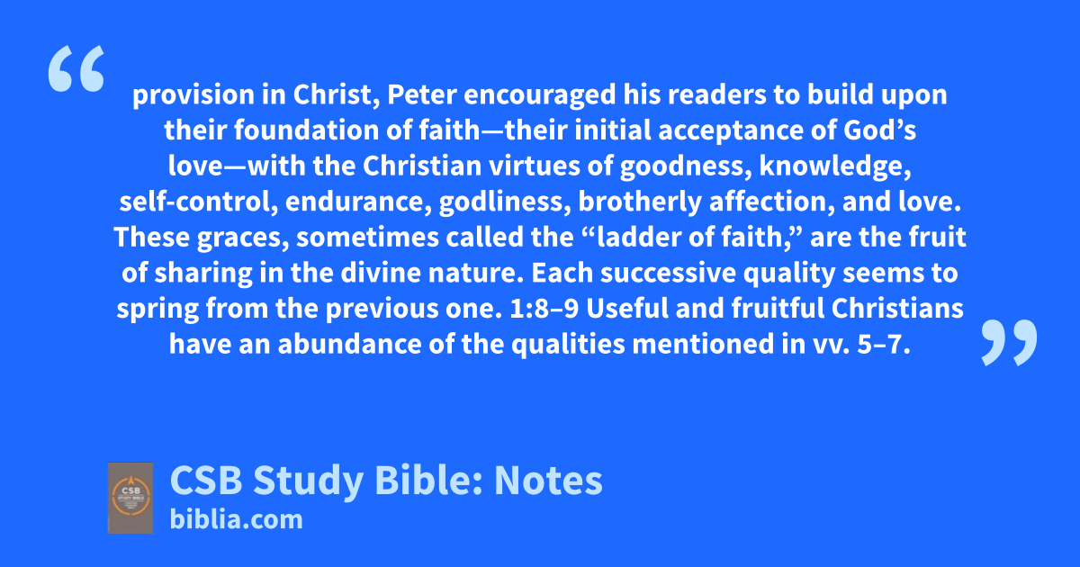 provision in Christ, Peter encouraged his readers to build upon their foundation of faith—their initial acceptance of God’s love—with the Christian virtues of goodness, knowledge, self-control, endurance, godliness, brotherly affection, and love. These graces, sometimes called the “ladder of faith,” are the fruit of sharing in the divine nature. Each successive quality seems to spring from the previous one. 1:8–9 Useful and fruitful Christians have an abundance of the qualities mentioned in vv. 5–7.