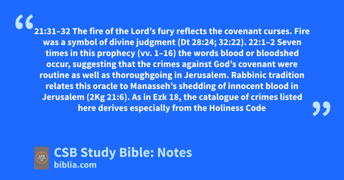21:31–32 The fire of the Lord’s fury reflects the covenant curses. Fire was a symbol of divine judgment (Dt 28:24; 32:22). 22:1–2 Seven times in this prophecy (vv. 1–16) the words blood or bloodshed occur, suggesting that the crimes against God’s covenant were routine as well as thoroughgoing in Jerusalem. Rabbinic tradition relates this oracle to Manasseh’s shedding of innocent blood in Jerusalem (2Kg 21:6). As in Ezk 18, the catalogue of crimes listed here derives especially from the Holiness Code