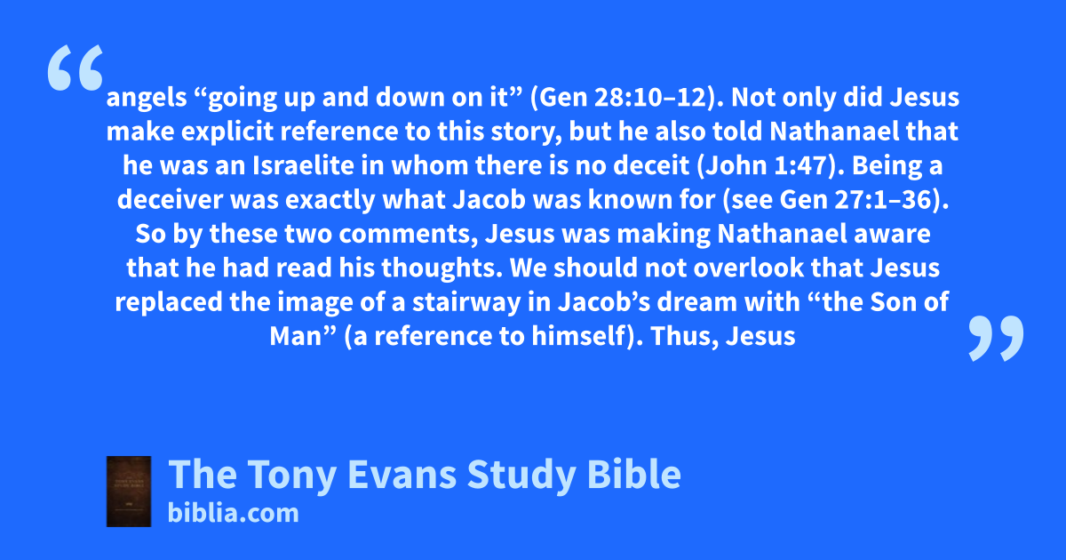 angels “going up and down on it” (Gen 28:10–12). Not only did Jesus make explicit reference to this story, but he also told Nathanael that he was an Israelite in whom there is no deceit (John 1:47). Being a deceiver was exactly what Jacob was known for (see Gen 27:1–36). So by these two comments, Jesus was making Nathanael aware that he had read his thoughts. We should not overlook that Jesus replaced the image of a stairway in Jacob’s dream with “the Son of Man” (a reference to himself). Thus, Jesus