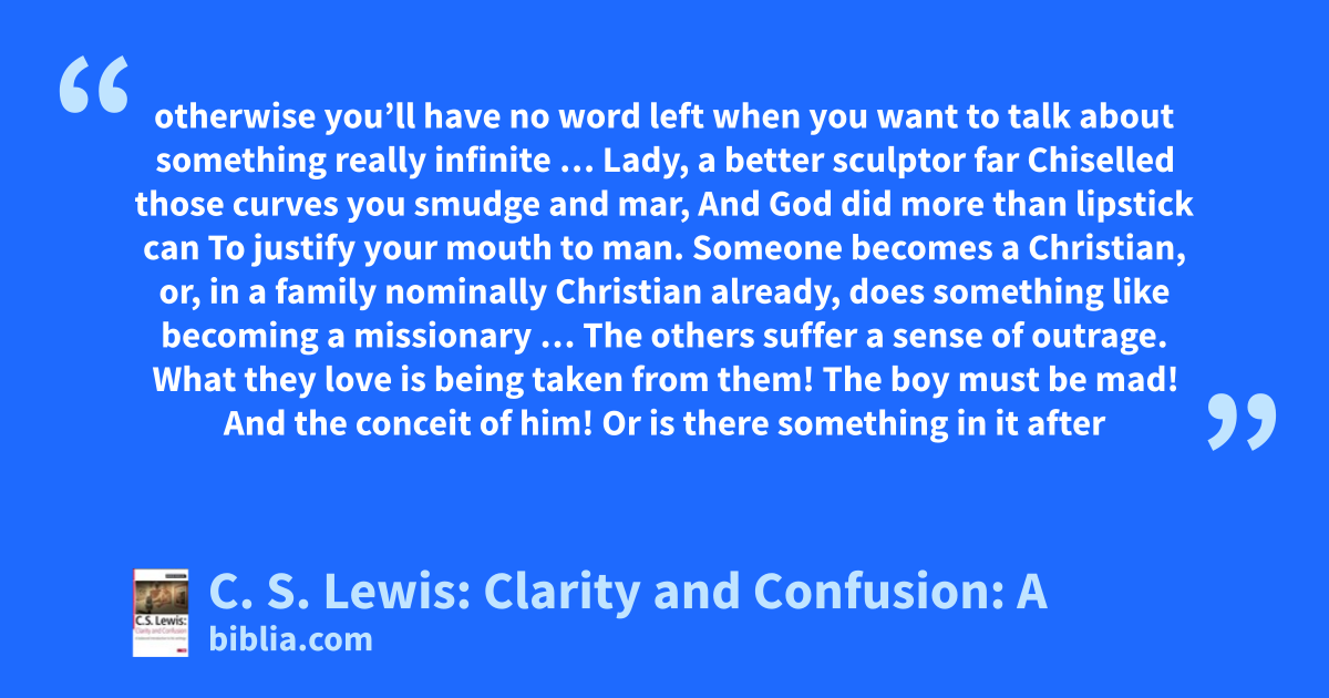 otherwise you’ll have no word left when you want to talk about something really infinite … Lady, a better sculptor far Chiselled those curves you smudge and mar, And God did more than lipstick can To justify your mouth to man. Someone becomes a Christian, or, in a family nominally Christian already, does something like becoming a missionary … The others suffer a sense of outrage. What they love is being taken from them! The boy must be mad! And the conceit of him! Or is there something in it after