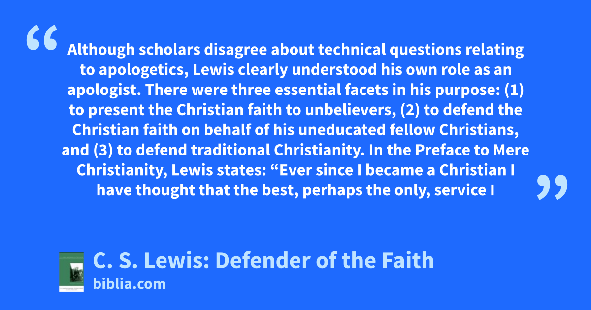 Although scholars disagree about technical questions relating to apologetics, Lewis clearly understood his own role as an apologist. There were three essential facets in his purpose: (1) to present the Christian faith to unbelievers, (2) to defend the Christian faith on behalf of his uneducated fellow Christians, and (3) to defend traditional Christianity. In the Preface to Mere Christianity, Lewis states: “Ever since I became a Christian I have thought that the best, perhaps the only, service I