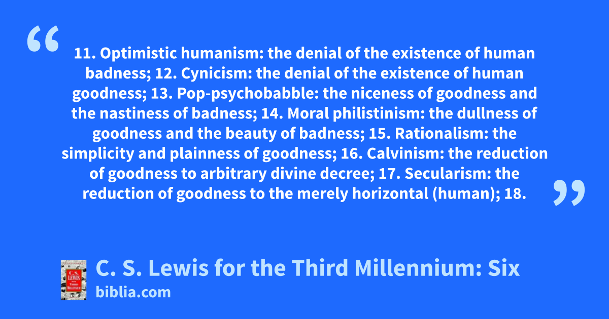 11. Optimistic humanism: the denial of the existence of human badness; 12. Cynicism: the denial of the existence of human goodness; 13. Pop-psychobabble: the niceness of goodness and the nastiness of badness; 14. Moral philistinism: the dullness of goodness and the beauty of badness; 15. Rationalism: the simplicity and plainness of goodness; 16. Calvinism: the reduction of goodness to arbitrary divine decree; 17. Secularism: the reduction of goodness to the merely horizontal (human); 18.