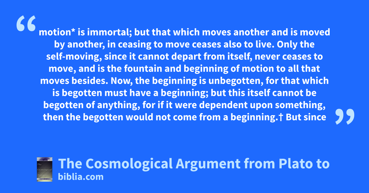 motion* is immortal; but that which moves another and is moved by another, in ceasing to move ceases also to live. Only the self-moving, since it cannot depart from itself, never ceases to move, and is the fountain and beginning of motion to all that moves besides. Now, the beginning is unbegotten, for that which is begotten must have a beginning; but this itself cannot be begotten of anything, for if it were dependent upon something, then the begotten would not come from a beginning.† But since