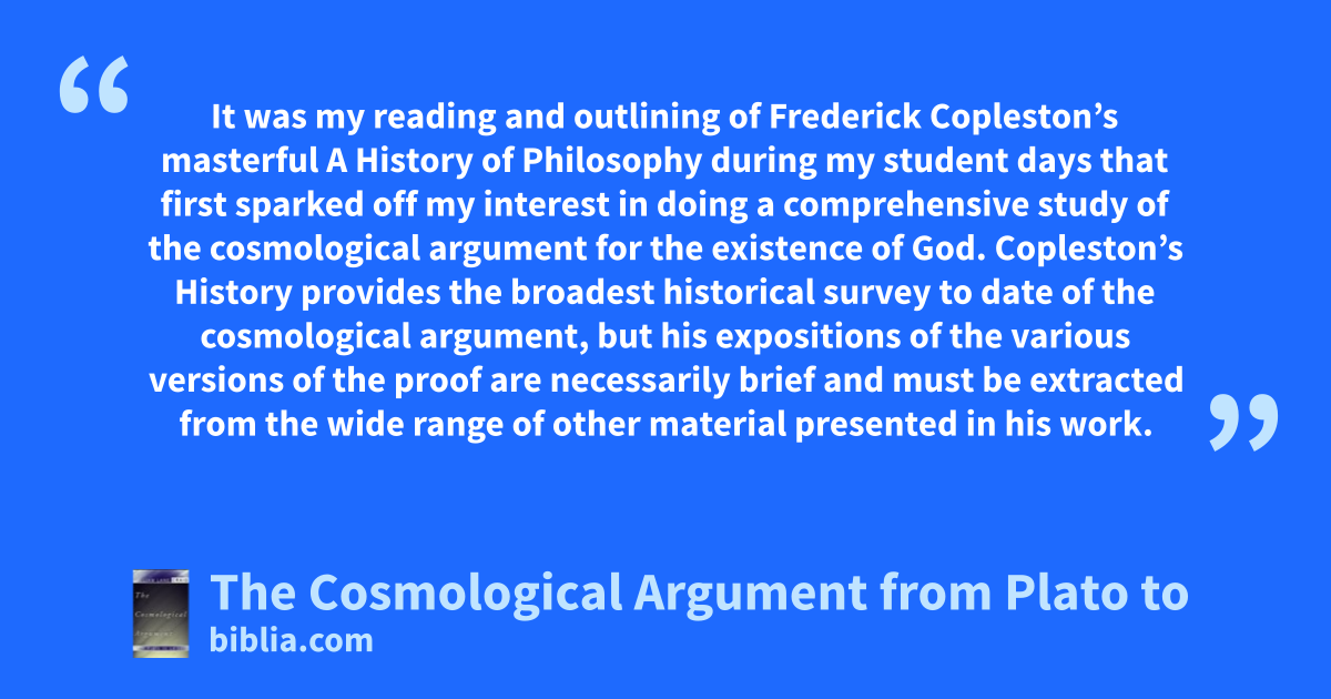 It was my reading and outlining of Frederick Copleston’s masterful A History of Philosophy during my student days that first sparked off my interest in doing a comprehensive study of the cosmological argument for the existence of God. Copleston’s History provides the broadest historical survey to date of the cosmological argument, but his expositions of the various versions of the proof are necessarily brief and must be extracted from the wide range of other material presented in his work.
