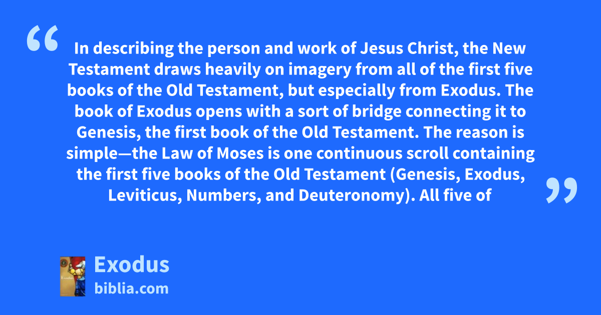 In describing the person and work of Jesus Christ, the New Testament draws heavily on imagery from all of the first five books of the Old Testament, but especially from Exodus. The book of Exodus opens with a sort of bridge connecting it to Genesis, the first book of the Old Testament. The reason is simple—the Law of Moses is one continuous scroll containing the first five books of the Old Testament (Genesis, Exodus, Leviticus, Numbers, and Deuteronomy). All five of