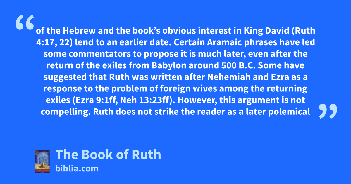 of the Hebrew and the book’s obvious interest in King David (Ruth 4:17, 22) lend to an earlier date. Certain Aramaic phrases have led some commentators to propose it is much later, even after the return of the exiles from Babylon around 500 B.C. Some have suggested that Ruth was written after Nehemiah and Ezra as a response to the problem of foreign wives among the returning exiles (Ezra 9:1ff, Neh 13:23ff). However, this argument is not compelling. Ruth does not strike the reader as a later polemical