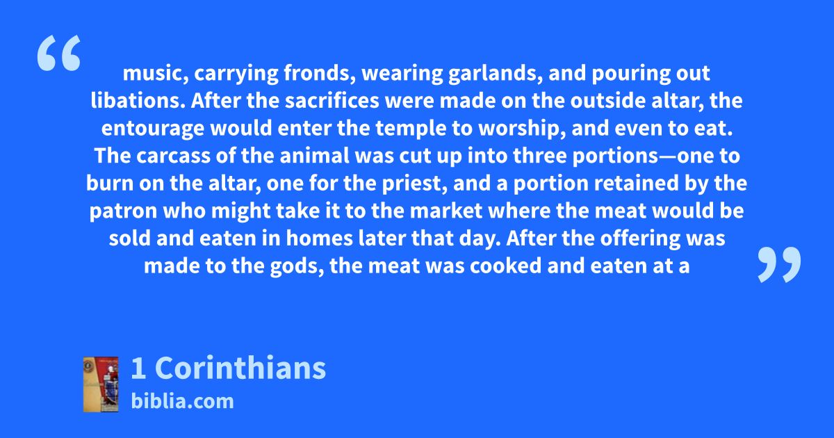 music, carrying fronds, wearing garlands, and pouring out libations. After the sacrifices were made on the outside altar, the entourage would enter the temple to worship, and even to eat. The carcass of the animal was cut up into three portions—one to burn on the altar, one for the priest, and a portion retained by the patron who might take it to the market where the meat would be sold and eaten in homes later that day. After the offering was made to the gods, the meat was cooked and eaten at a