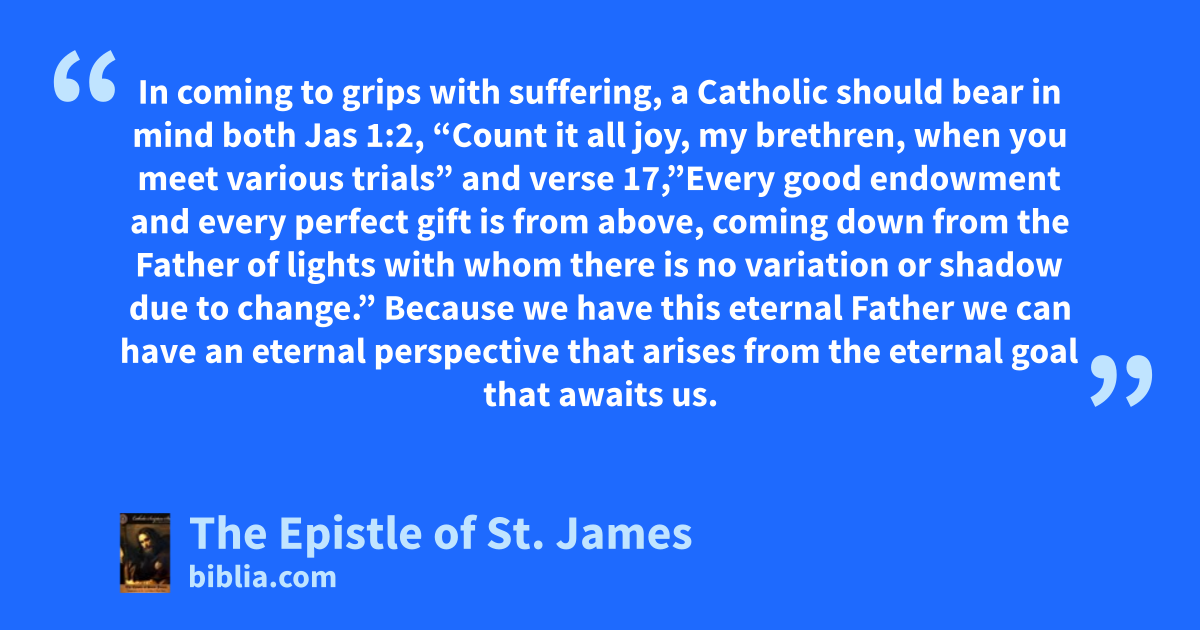 In coming to grips with suffering, a Catholic should bear in mind both Jas 1:2, “Count it all joy, my brethren, when you meet various trials” and verse 17,”Every good endowment and every perfect gift is from above, coming down from the Father of lights with whom there is no variation or shadow due to change.” Because we have this eternal Father we can have an eternal perspective that arises from the eternal goal that awaits us.