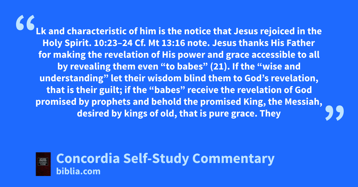 Lk and characteristic of him is the notice that Jesus rejoiced in the Holy Spirit. 10:23–24 Cf. Mt 13:16 note. Jesus thanks His Father for making the revelation of His power and grace accessible to all by revealing them even “to babes” (21). If the “wise and understanding” let their wisdom blind them to God’s revelation, that is their guilt; if the “babes” receive the revelation of God promised by prophets and behold the promised King, the Messiah, desired by kings of old, that is pure grace. They