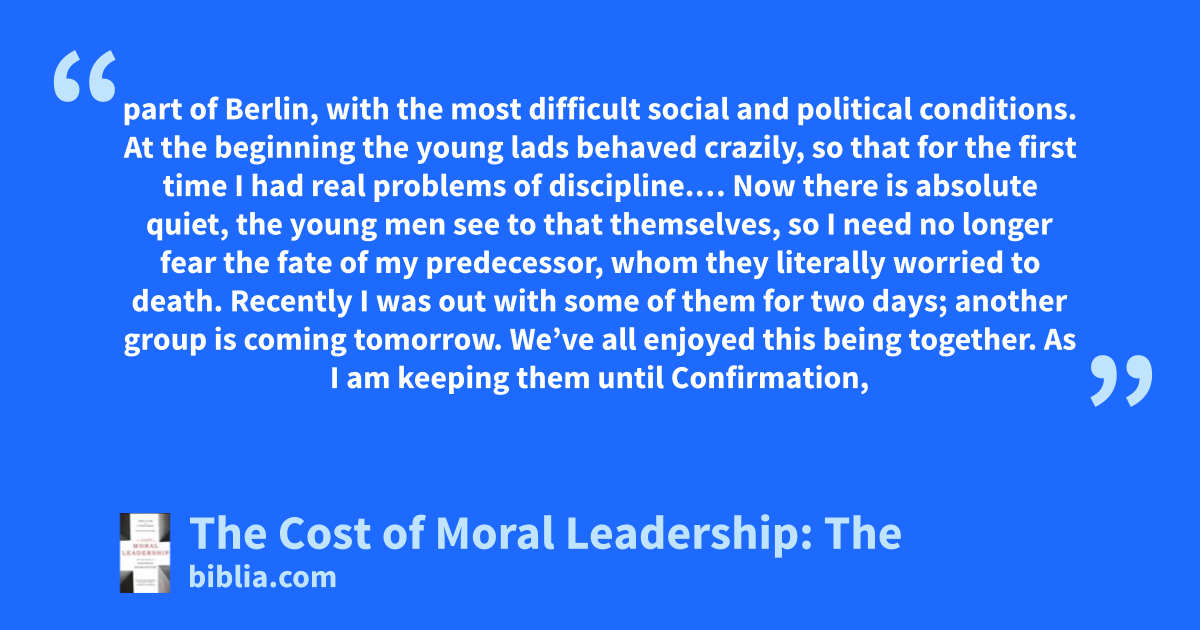part of Berlin, with the most difficult social and political conditions. At the beginning the young lads behaved crazily, so that for the first time I had real problems of discipline.… Now there is absolute quiet, the young men see to that themselves, so I need no longer fear the fate of my predecessor, whom they literally worried to death. Recently I was out with some of them for two days; another group is coming tomorrow. We’ve all enjoyed this being together. As I am keeping them until Confirmation,