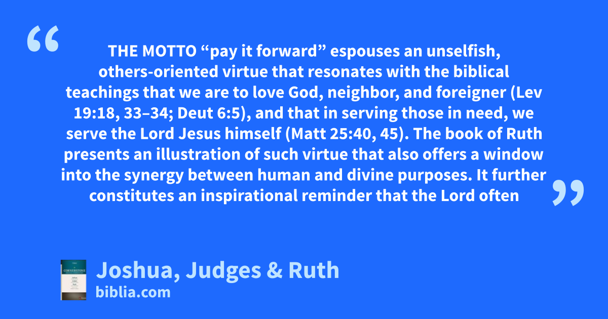 THE MOTTO “pay it forward” espouses an unselfish, others-oriented virtue that resonates with the biblical teachings that we are to love God, neighbor, and foreigner (Lev 19:18, 33–34; Deut 6:5), and that in serving those in need, we serve the Lord Jesus himself (Matt 25:40, 45). The book of Ruth presents an illustration of such virtue that also offers a window into the synergy between human and divine purposes. It further constitutes an inspirational reminder that the Lord often