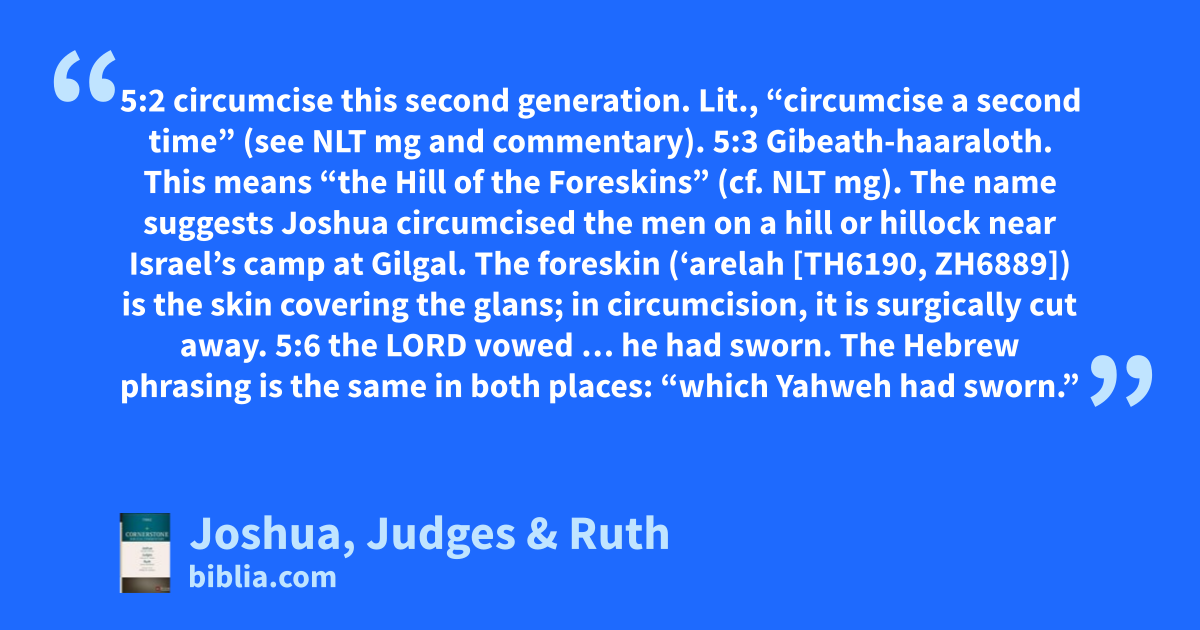 5:2 circumcise this second generation. Lit., “circumcise a second time” (see NLT mg and commentary). 5:3 Gibeath-haaraloth. This means “the Hill of the Foreskins” (cf. NLT mg). The name suggests Joshua circumcised the men on a hill or hillock near Israel’s camp at Gilgal. The foreskin (‘arelah [TH6190, ZH6889]) is the skin covering the glans; in circumcision, it is surgically cut away. 5:6 the LORD vowed … he had sworn. The Hebrew phrasing is the same in both places: “which Yahweh had sworn.”
