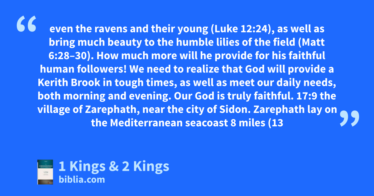 even the ravens and their young (Luke 12:24), as well as bring much beauty to the humble lilies of the field (Matt 6:28–30). How much more will he provide for his faithful human followers! We need to realize that God will provide a Kerith Brook in tough times, as well as meet our daily needs, both morning and evening. Our God is truly faithful. 17:9 the village of Zarephath, near the city of Sidon. Zarephath lay on the Mediterranean seacoast 8 miles (13