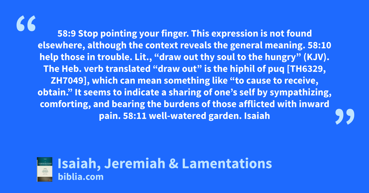 58:9 Stop pointing your finger. This expression is not found elsewhere, although the context reveals the general meaning. 58:10 help those in trouble. Lit., “draw out thy soul to the hungry” (KJV). The Heb. verb translated “draw out” is the hiphil of puq [TH6329, ZH7049], which can mean something like “to cause to receive, obtain.” It seems to indicate a sharing of one’s self by sympathizing, comforting, and bearing the burdens of those afflicted with inward pain. 58:11 well-watered garden. Isaiah