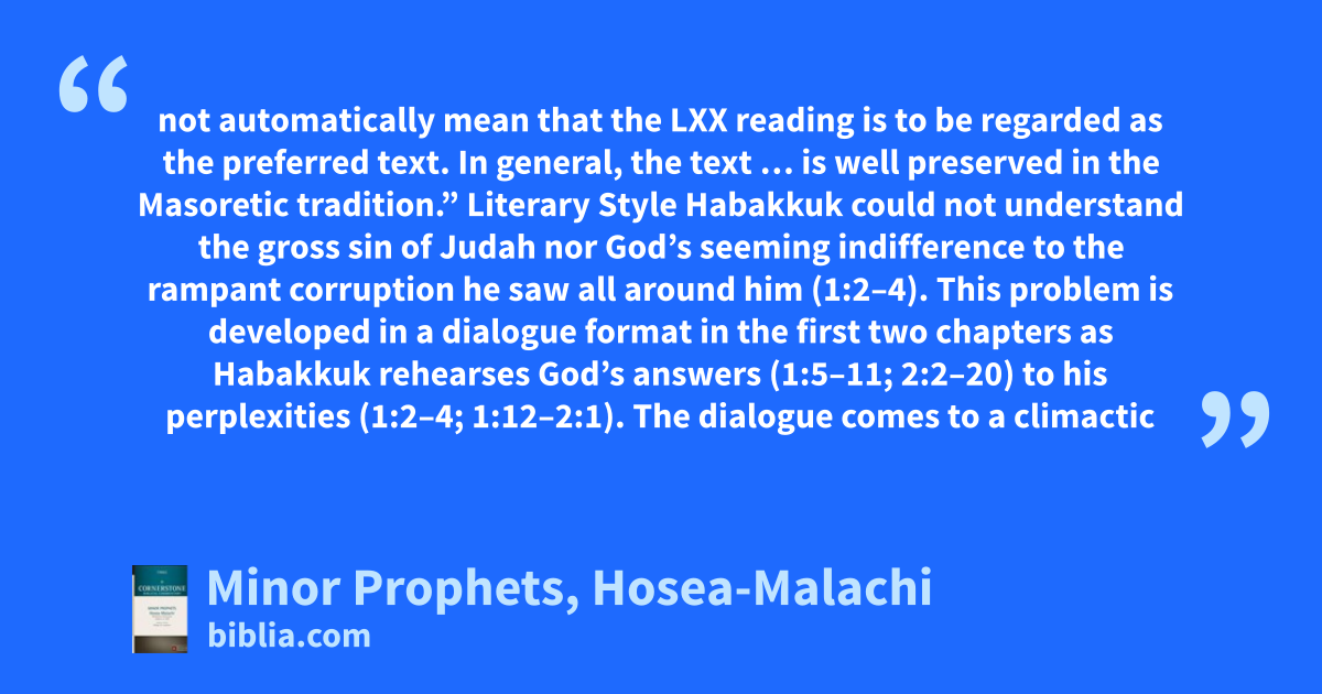 not automatically mean that the LXX reading is to be regarded as the preferred text. In general, the text … is well preserved in the Masoretic tradition.” Literary Style Habakkuk could not understand the gross sin of Judah nor God’s seeming indifference to the rampant corruption he saw all around him (1:2–4). This problem is developed in a dialogue format in the first two chapters as Habakkuk rehearses God’s answers (1:5–11; 2:2–20) to his perplexities (1:2–4; 1:12–2:1). The dialogue comes to a climactic