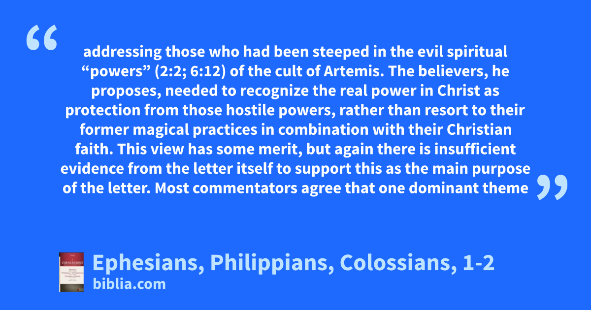 addressing those who had been steeped in the evil spiritual “powers” (2:2; 6:12) of the cult of Artemis. The believers, he proposes, needed to recognize the real power in Christ as protection from those hostile powers, rather than resort to their former magical practices in combination with their Christian faith. This view has some merit, but again there is insufficient evidence from the letter itself to support this as the main purpose of the letter. Most commentators agree that one dominant theme