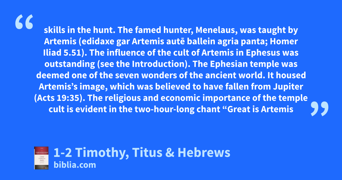 skills in the hunt. The famed hunter, Menelaus, was taught by Artemis (edidaxe gar Artemis autē ballein agria panta; Homer Iliad 5.51). The influence of the cult of Artemis in Ephesus was outstanding (see the Introduction). The Ephesian temple was deemed one of the seven wonders of the ancient world. It housed Artemis’s image, which was believed to have fallen from Jupiter (Acts 19:35). The religious and economic importance of the temple cult is evident in the two-hour-long chant “Great is Artemis
