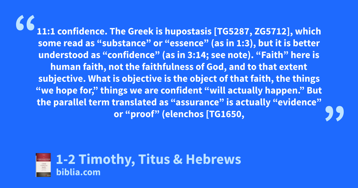 11:1 confidence. The Greek is hupostasis [TG5287, ZG5712], which some read as “substance” or “essence” (as in 1:3), but it is better understood as “confidence” (as in 3:14; see note). “Faith” here is human faith, not the faithfulness of God, and to that extent subjective. What is objective is the object of that faith, the things “we hope for,” things we are confident “will actually happen.” But the parallel term translated as “assurance” is actually “evidence” or “proof” (elenchos [TG1650,