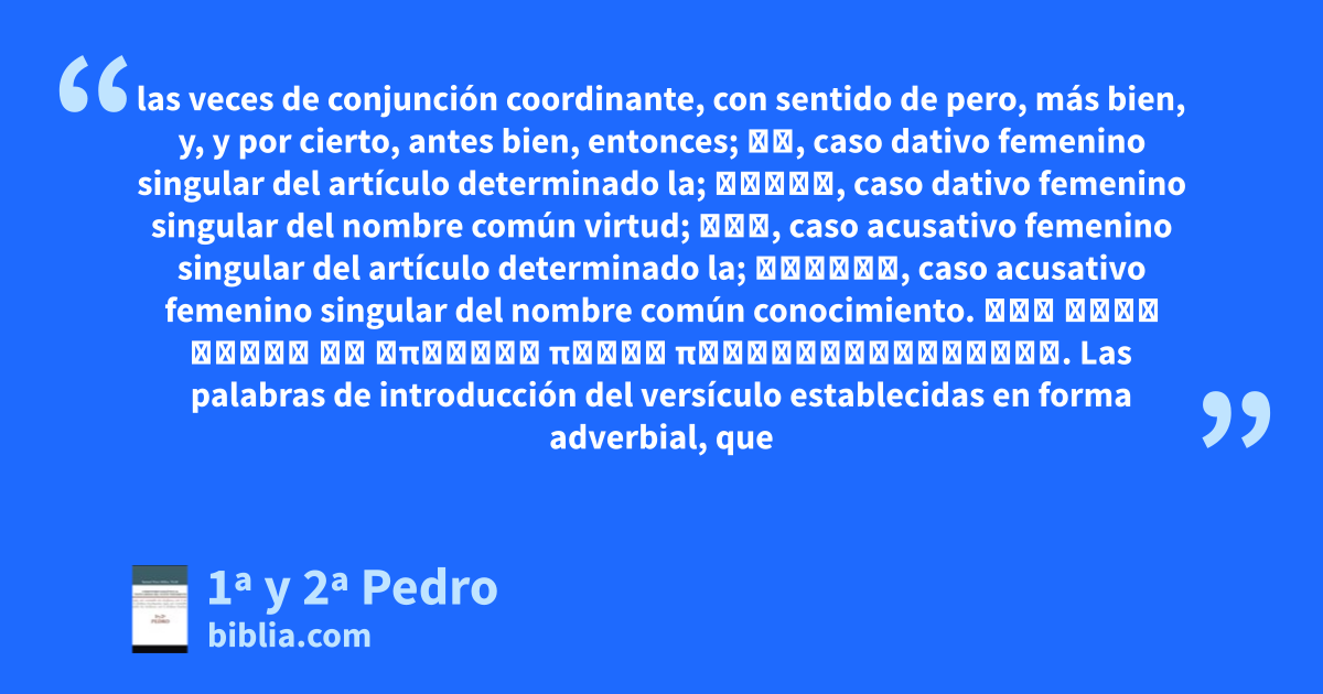 las veces de conjunción coordinante, con sentido de pero, más bien, y, y por cierto, antes bien, entonces; τῇ, caso dativo femenino singular del artículo determinado la; ἀρετῇ, caso dativo femenino singular del nombre común virtud; τὴν, caso acusativo femenino singular del artículo determinado la; γνῶσιν, caso acusativo femenino singular del nombre común conocimiento. Καὶ αὐτὸ τοῦτο δὲ σπουδὴν πᾶσαν παρεισενέγκαντες. Las palabras de introducción del versículo establecidas en forma adverbial, que