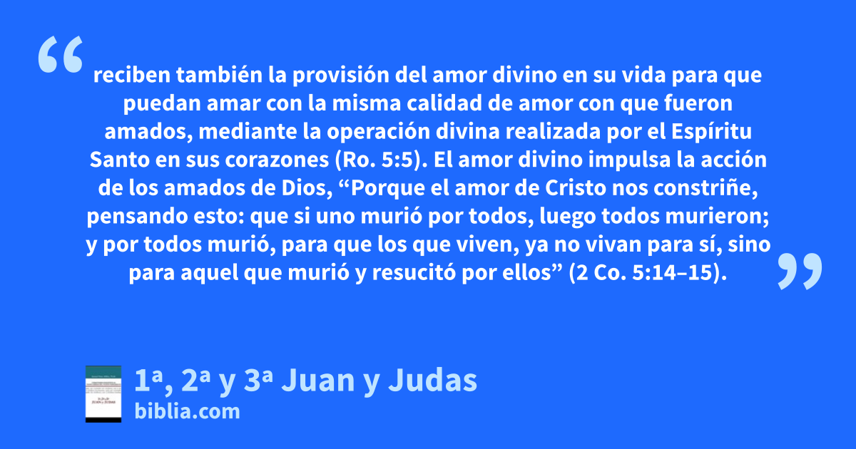 reciben también la provisión del amor divino en su vida para que puedan amar con la misma calidad de amor con que fueron amados, mediante la operación divina realizada por el Espíritu Santo en sus corazones (Ro. 5:5). El amor divino impulsa la acción de los amados de Dios, “Porque el amor de Cristo nos constriñe, pensando esto: que si uno murió por todos, luego todos murieron; y por todos murió, para que los que viven, ya no vivan para sí, sino para aquel que murió y resucitó por ellos” (2 Co. 5:14–15).