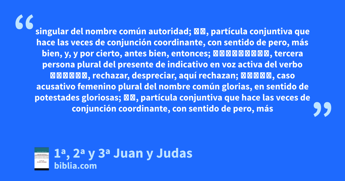 singular del nombre común autoridad; δὲ, partícula conjuntiva que hace las veces de conjunción coordinante, con sentido de pero, más bien, y, y por cierto, antes bien, entonces; ἀθετοῦσιν, tercera persona plural del presente de indicativo en voz activa del verbo ἀθετέω, rechazar, despreciar, aquí rechazan; δόξας, caso acusativo femenino plural del nombre común glorias, en sentido de potestades gloriosas; δὲ, partícula conjuntiva que hace las veces de conjunción coordinante, con sentido de pero, más