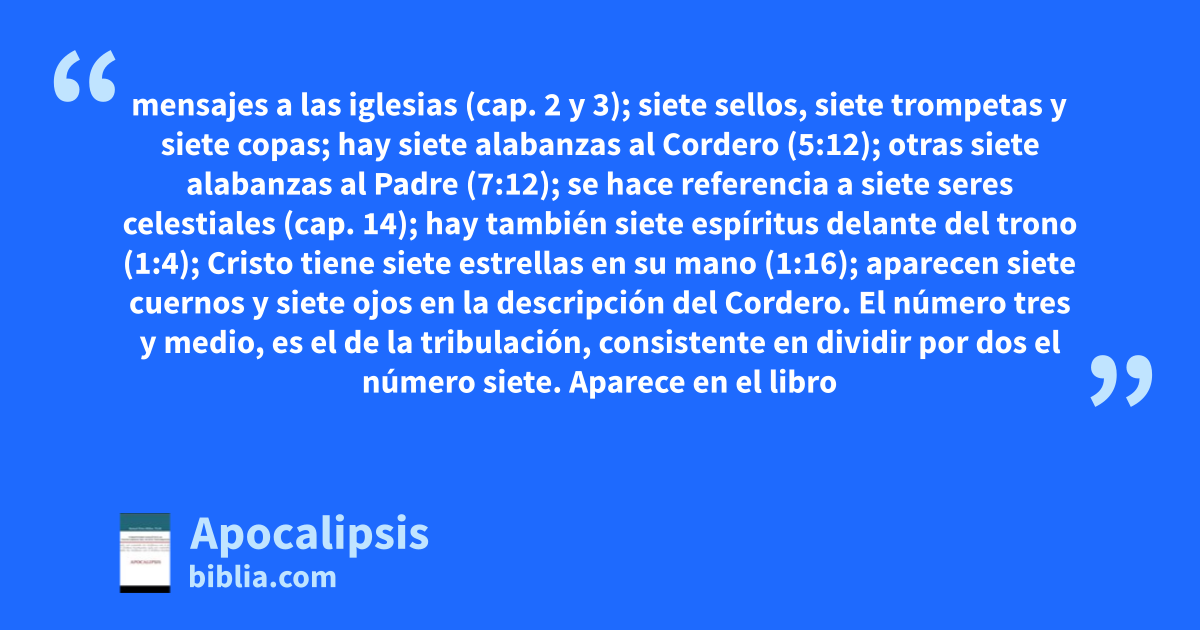mensajes a las iglesias (cap. 2 y 3); siete sellos, siete trompetas y siete copas; hay siete alabanzas al Cordero (5:12); otras siete alabanzas al Padre (7:12); se hace referencia a siete seres celestiales (cap. 14); hay también siete espíritus delante del trono (1:4); Cristo tiene siete estrellas en su mano (1:16); aparecen siete cuernos y siete ojos en la descripción del Cordero. El número tres y medio, es el de la tribulación, consistente en dividir por dos el número siete. Aparece en el libro