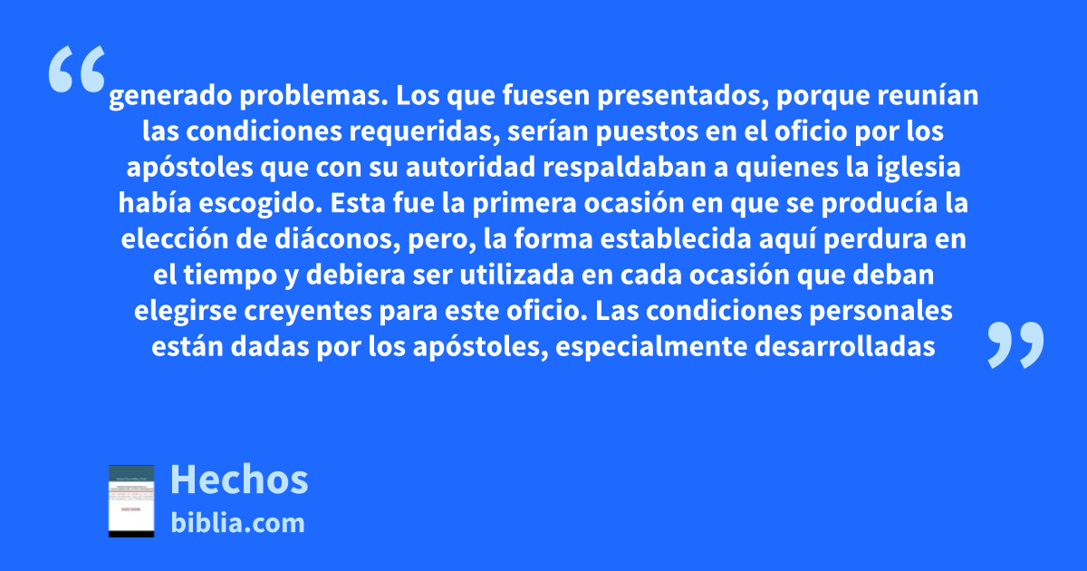 generado problemas. Los que fuesen presentados, porque reunían las condiciones requeridas, serían puestos en el oficio por los apóstoles que con su autoridad respaldaban a quienes la iglesia había escogido. Esta fue la primera ocasión en que se producía la elección de diáconos, pero, la forma establecida aquí perdura en el tiempo y debiera ser utilizada en cada ocasión que deban elegirse creyentes para este oficio. Las condiciones personales están dadas por los apóstoles, especialmente desarrolladas