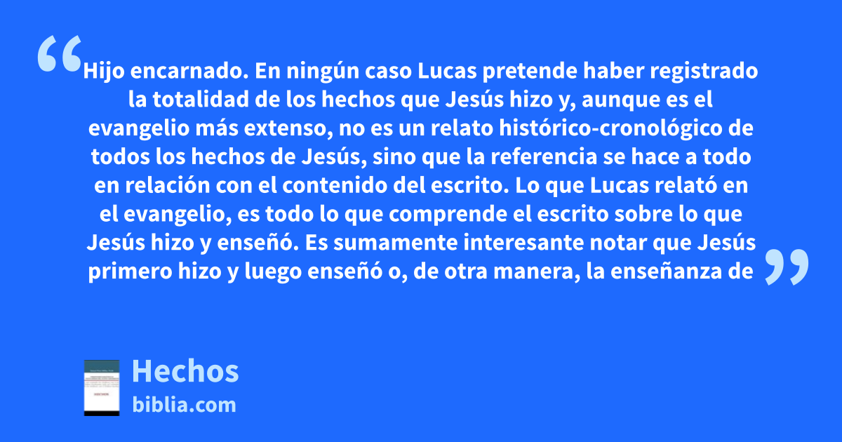 Hijo encarnado. En ningún caso Lucas pretende haber registrado la totalidad de los hechos que Jesús hizo y, aunque es el evangelio más extenso, no es un relato histórico-cronológico de todos los hechos de Jesús, sino que la referencia se hace a todo en relación con el contenido del escrito. Lo que Lucas relató en el evangelio, es todo lo que comprende el escrito sobre lo que Jesús hizo y enseñó. Es sumamente interesante notar que Jesús primero hizo y luego enseñó o, de otra manera, la enseñanza de