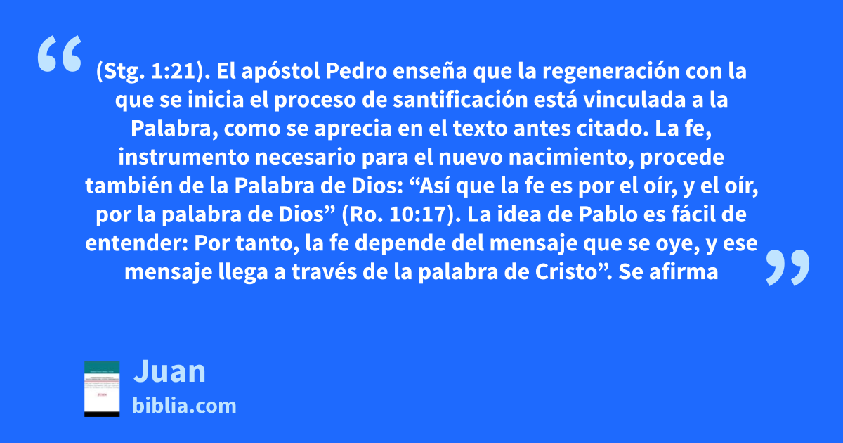 (Stg. 1:21). El apóstol Pedro enseña que la regeneración con la que se inicia el proceso de santificación está vinculada a la Palabra, como se aprecia en el texto antes citado. La fe, instrumento necesario para el nuevo nacimiento, procede también de la Palabra de Dios: “Así que la fe es por el oír, y el oír, por la palabra de Dios” (Ro. 10:17). La idea de Pablo es fácil de entender: Por tanto, la fe depende del mensaje que se oye, y ese mensaje llega a través de la palabra de Cristo”. Se afirma