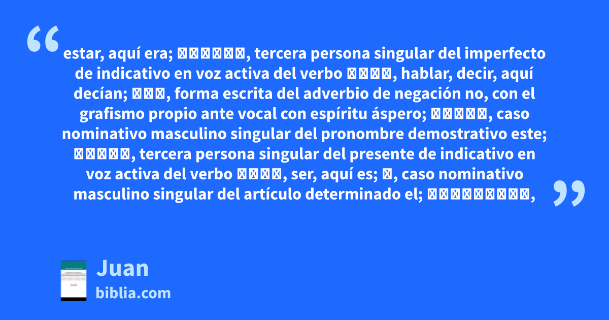 estar, aquí era; ἔλεγον, tercera persona singular del imperfecto de indicativo en voz activa del verbo λέγω, hablar, decir, aquí decían; οὐχ, forma escrita del adverbio de negación no, con el grafismo propio ante vocal con espíritu áspero; οὗτος, caso nominativo masculino singular del pronombre demostrativo este; ἐστιν, tercera persona singular del presente de indicativo en voz activa del verbo εἰμί, ser, aquí es; ὁ, caso nominativo masculino singular del artículo determinado el; καθήμενος,