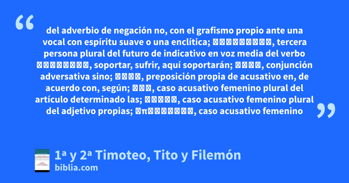 del adverbio de negación no, con el grafismo propio ante una vocal con espíritu suave o una enclítica; ἀνέξονται, tercera persona plural del futuro de indicativo en voz media del verbo ἀνέχομαι, soportar, sufrir, aquí soportarán; ἀλλὰ, conjunción adversativa sino; κατὰ, preposición propia de acusativo en, de acuerdo con, según; τὰς, caso acusativo femenino plural del artículo determinado las; ἰδίας, caso acusativo femenino plural del adjetivo propias; ἐπιθυμίας, caso acusativo femenino