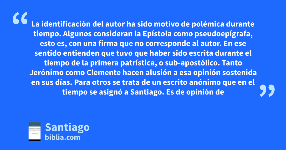 La identificación del autor ha sido motivo de polémica durante tiempo. Algunos consideran la Epístola como pseudoepígrafa, esto es, con una firma que no corresponde al autor. En ese sentido entienden que tuvo que haber sido escrita durante el tiempo de la primera patrística, o sub-apostólico. Tanto Jerónimo como Clemente hacen alusión a esa opinión sostenida en sus días. Para otros se trata de un escrito anónimo que en el tiempo se asignó a Santiago. Es de opinión de