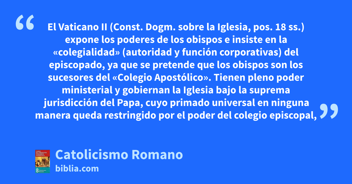 El Vaticano II (Const. Dogm. sobre la Iglesia, pos. 18 ss.) expone los poderes de los obispos e insiste en la «colegialidad» (autoridad y función corporativas) del episcopado, ya que se pretende que los obispos son los sucesores del «Colegio Apostólico». Tienen pleno poder ministerial y gobiernan la Iglesia bajo la suprema jurisdicción del Papa, cuyo primado universal en ninguna manera queda restringido por el poder del colegio episcopal,