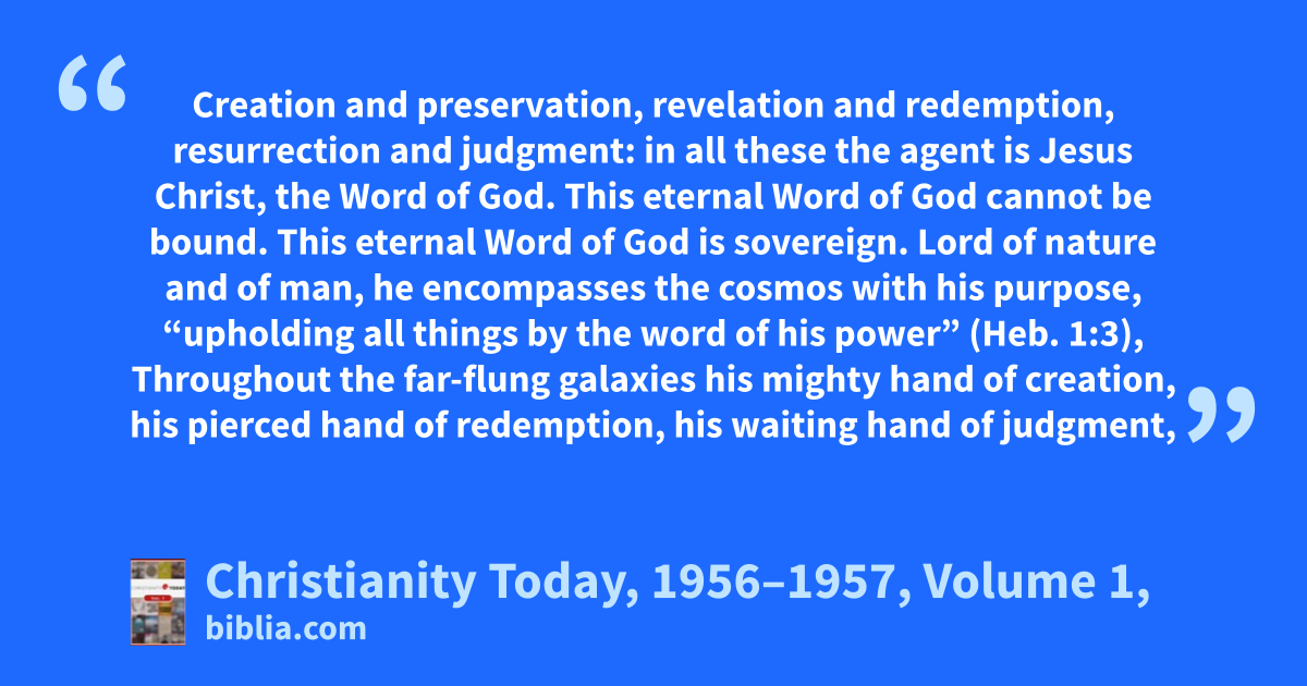 Creation and preservation, revelation and redemption, resurrection and judgment: in all these the agent is Jesus Christ, the Word of God. This eternal Word of God cannot be bound. This eternal Word of God is sovereign. Lord of nature and of man, he encompasses the cosmos with his purpose, “upholding all things by the word of his power” (Heb. 1:3), Throughout the far-flung galaxies his mighty hand of creation, his pierced hand of redemption, his waiting hand of judgment,