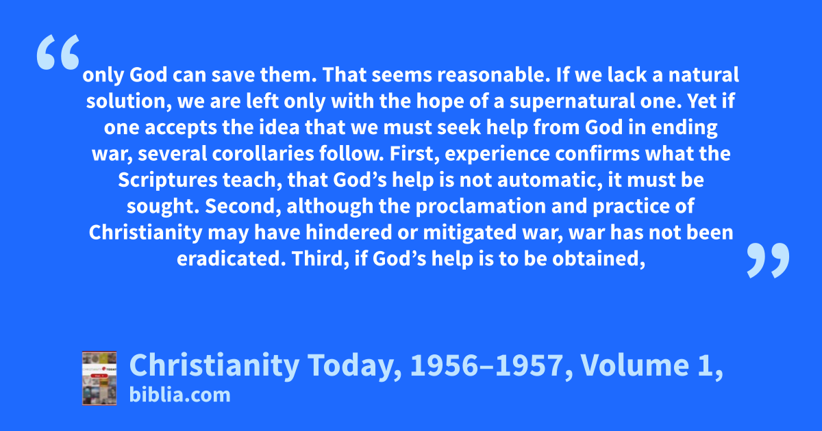 only God can save them. That seems reasonable. If we lack a natural solution, we are left only with the hope of a supernatural one. Yet if one accepts the idea that we must seek help from God in ending war, several corollaries follow. First, experience confirms what the Scriptures teach, that God’s help is not automatic, it must be sought. Second, although the proclamation and practice of Christianity may have hindered or mitigated war, war has not been eradicated. Third, if God’s help is to be obtained,