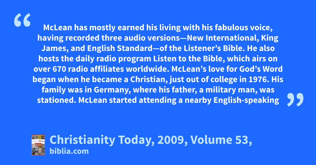 McLean has mostly earned his living with his fabulous voice, having recorded three audio versions—New International, King James, and English Standard—of the Listener’s Bible. He also hosts the daily radio program Listen to the Bible, which airs on over 670 radio affiliates worldwide. McLean’s love for God’s Word began when he became a Christian, just out of college in 1976. His family was in Germany, where his father, a military man, was stationed. McLean started attending a nearby English-speaking