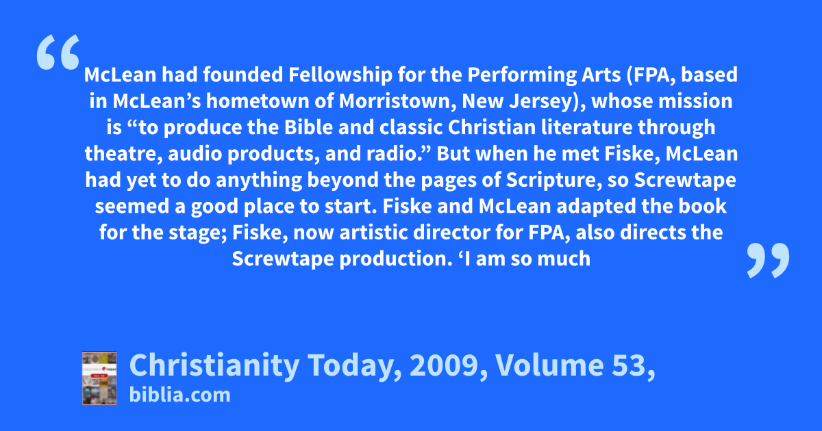 McLean had founded Fellowship for the Performing Arts (FPA, based in McLean’s hometown of Morristown, New Jersey), whose mission is “to produce the Bible and classic Christian literature through theatre, audio products, and radio.” But when he met Fiske, McLean had yet to do anything beyond the pages of Scripture, so Screwtape seemed a good place to start. Fiske and McLean adapted the book for the stage; Fiske, now artistic director for FPA, also directs the Screwtape production. ‘I am so much