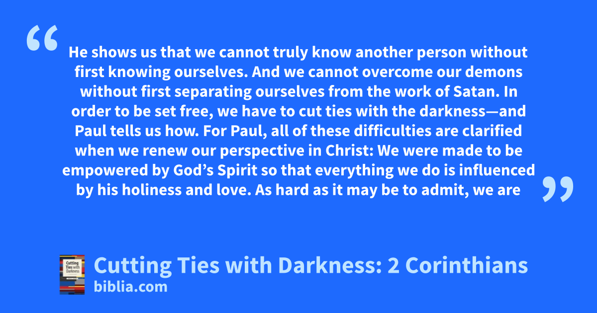 He shows us that we cannot truly know another person without first knowing ourselves. And we cannot overcome our demons without first separating ourselves from the work of Satan. In order to be set free, we have to cut ties with the darkness—and Paul tells us how. For Paul, all of these difficulties are clarified when we renew our perspective in Christ: We were made to be empowered by God’s Spirit so that everything we do is influenced by his holiness and love. As hard as it may be to admit, we are