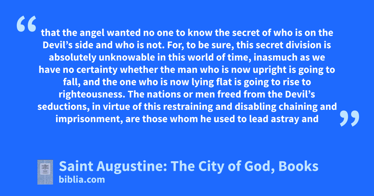 that the angel wanted no one to know the secret of who is on the Devil’s side and who is not. For, to be sure, this secret division is absolutely unknowable in this world of time, inasmuch as we have no certainty whether the man who is now upright is going to fall, and the one who is now lying flat is going to rise to righteousness. The nations or men freed from the Devil’s seductions, in virtue of this restraining and disabling chaining and imprisonment, are those whom he used to lead astray and