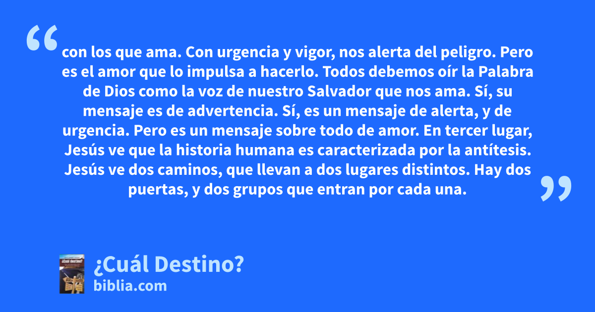 con los que ama. Con urgencia y vigor, nos alerta del peligro. Pero es el amor que lo impulsa a hacerlo. Todos debemos oír la Palabra de Dios como la voz de nuestro Salvador que nos ama. Sí, su mensaje es de advertencia. Sí, es un mensaje de alerta, y de urgencia. Pero es un mensaje sobre todo de amor. En tercer lugar, Jesús ve que la historia humana es caracterizada por la antítesis. Jesús ve dos caminos, que llevan a dos lugares distintos. Hay dos puertas, y dos grupos que entran por cada una.