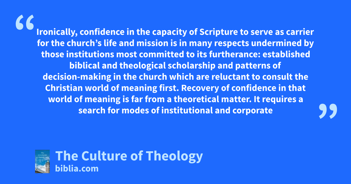 Ironically, confidence in the capacity of Scripture to serve as carrier for the church’s life and mission is in many respects undermined by those institutions most committed to its furtherance: established biblical and theological scholarship and patterns of decision-making in the church which are reluctant to consult the Christian world of meaning first. Recovery of confidence in that world of meaning is far from a theoretical matter. It requires a search for modes of institutional and corporate