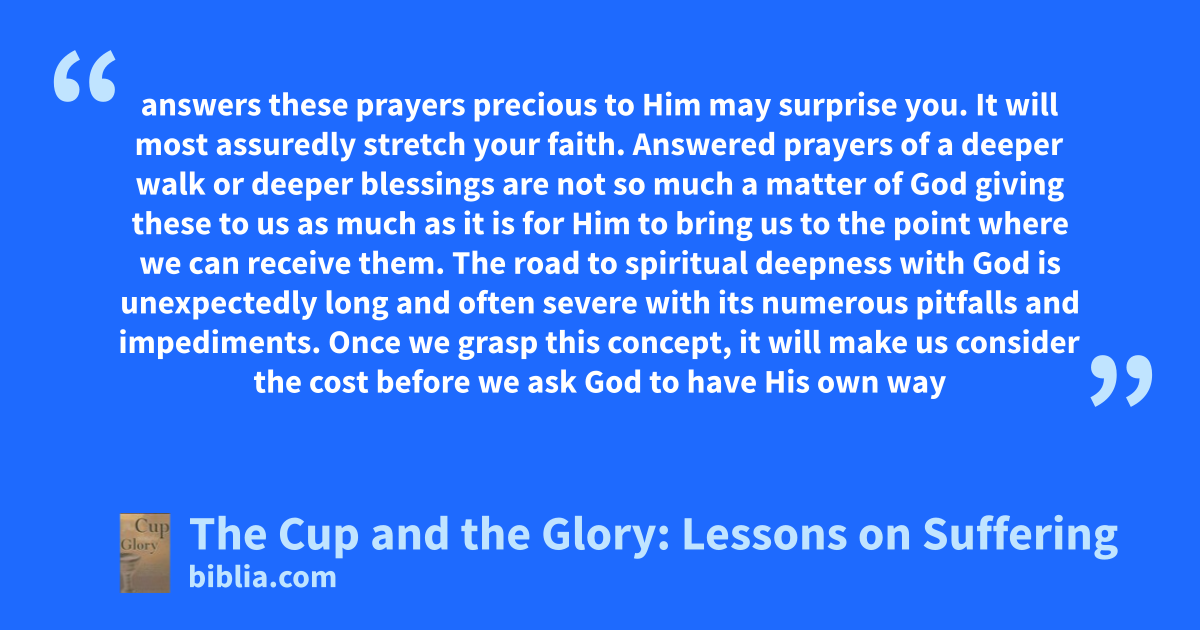 answers these prayers precious to Him may surprise you. It will most assuredly stretch your faith. Answered prayers of a deeper walk or deeper blessings are not so much a matter of God giving these to us as much as it is for Him to bring us to the point where we can receive them. The road to spiritual deepness with God is unexpectedly long and often severe with its numerous pitfalls and impediments. Once we grasp this concept, it will make us consider the cost before we ask God to have His own way