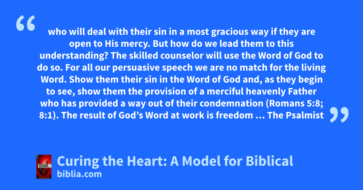 who will deal with their sin in a most gracious way if they are open to His mercy. But how do we lead them to this understanding? The skilled counselor will use the Word of God to do so. For all our persuasive speech we are no match for the living Word. Show them their sin in the Word of God and, as they begin to see, show them the provision of a merciful heavenly Father who has provided a way out of their condemnation (Romans 5:8; 8:1). The result of God’s Word at work is freedom … The Psalmist